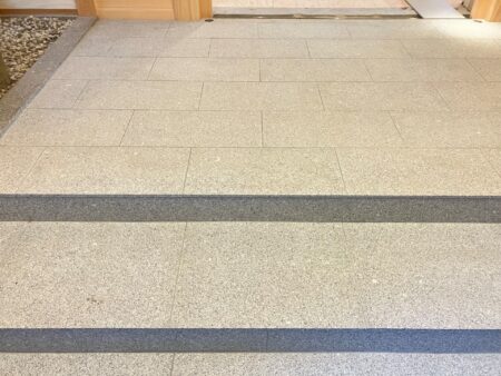カーペットから「石目調のタイル」へと張り替えを行います。