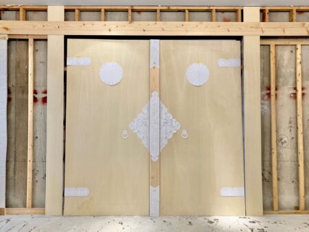 御殿入口の扉を引き分けから「中央開き」へと変更し、婚礼時などのフォトスポットともなるよう「菊花御紋」を配した錺金具の華麗な御扉とします。