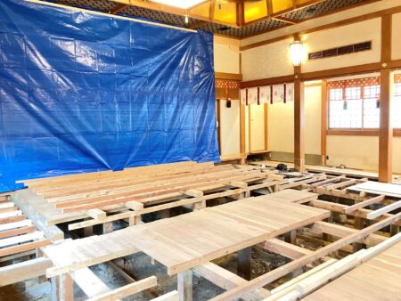 永年、神前結婚式の神殿として親しまれ、時にはお祓いを奉仕する祈願殿として当神社を支え、昨秋には“御鳳輦”を奉安する「鳳凰殿」となった御殿を改装することとなりました。