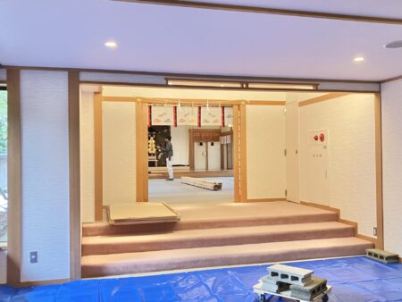改装前は、殿内同様、カーペットであった正面階段については「石張り」とし、新たに取り付けられる御扉との調和も美しく、祝事の際の記念撮影スポットになります。